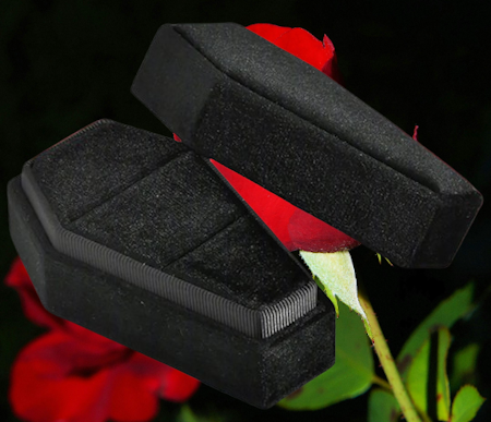 3ct version - Blood red Coffin Gem (8x12mm), flanked on each side by our 1ct Mold green Coffin Gems (4x6mm).